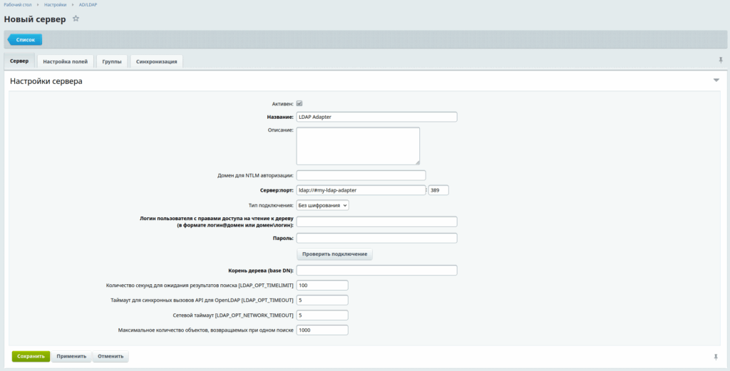 В админке, в качестве основного LDAP сервера, мы задаем подключение к LDAP Adapter