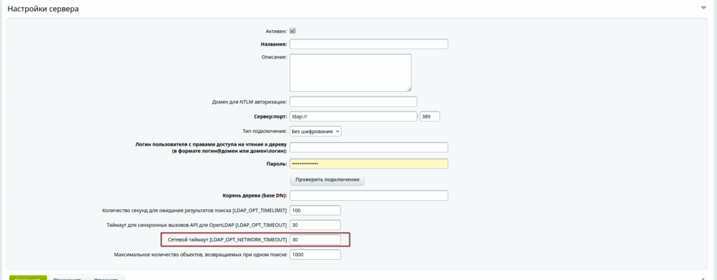 При тестировании двухфакторной авторизации, у вас вероятно возникнет проблема с тем, что пользователю дается очень мало времени на то, чтобы подтвердить свой вход. Чтобы это исправить, вам нужно будет увеличить значение поля Сетевой таймаут в настройках сервера AD в Битрикс