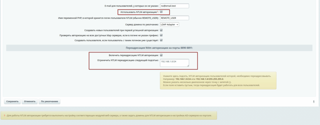 • При NTLM-авторизации пользователи будут авторизовываться напрямую через AD.
